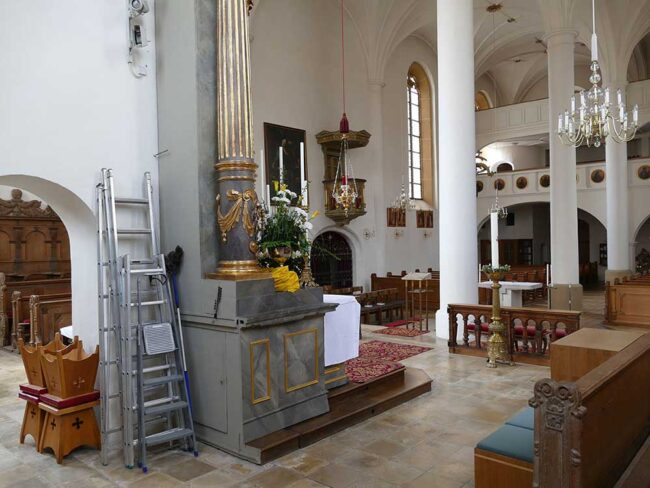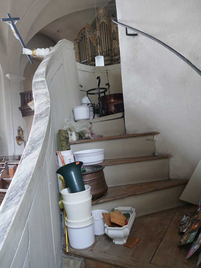 Hinter dem Altar ist traditionell der Platz für Equipement. Dumm nur, wenn der Altar so frei zugänglich ist.